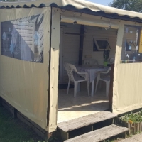 Terrasse extérieure récente avec auvent.