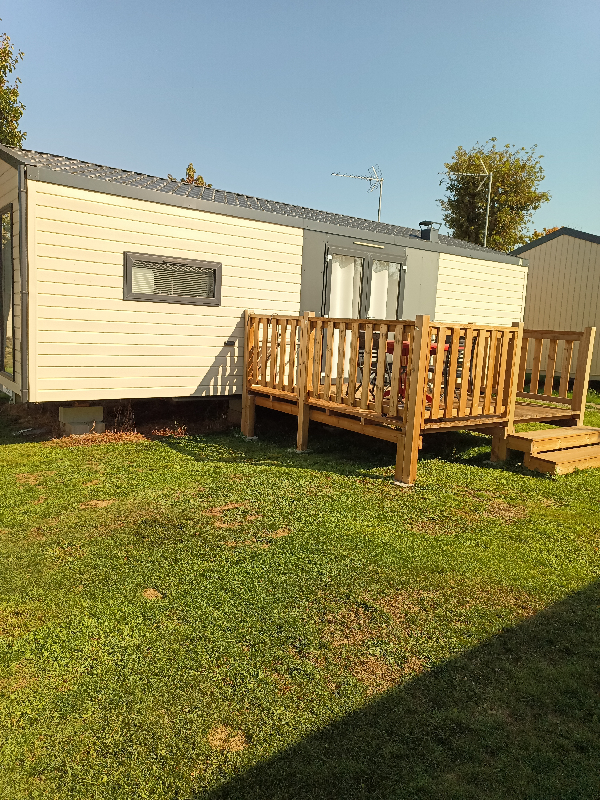 Mobil home rideau Kaléda duo, 1 chambre parental, 1 chambre avec lit gigogne, 1 WC séparés, 1 douche avec sèche serviette, 1 cuisine en longueur avec four en hauteur frigo avec congélateur en bas, 1 grand salons central, plein de rangement, 1 machine à laver.