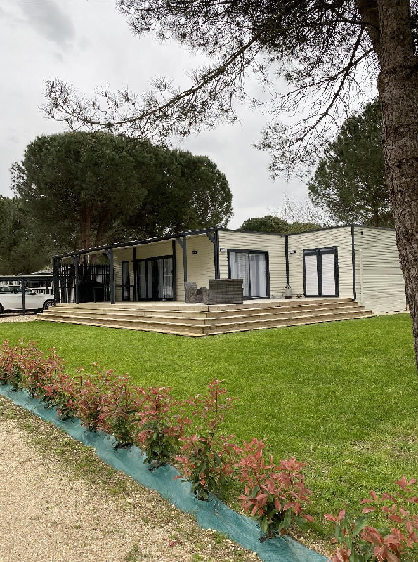 Mobil-home installé sur une parcelle de 671 m2 avec terrasse de 45m2 en L + avancée couverte - 2 cabanons de 9m2 ainsi qu’un car port voiture et emplacement pour moto, vélos
