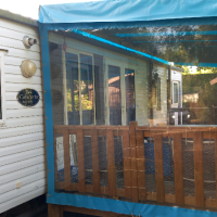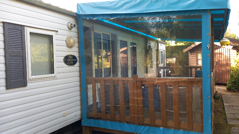 Terrasse neuve de 2021 marque du Lys 600/250 avec joue gauche vitrée toit turquoise.