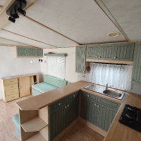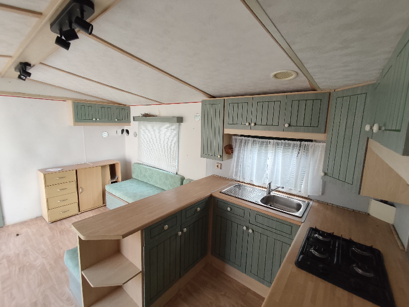 Mobil-home équipé d'une plaque 4 feux gaz, une hotte ainsi qu'un réfrigérateur.
