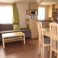 Mobilhome 2 chambres, avec chauffage central, four encastré et salon panoramique avec vue sur étang de pêche.